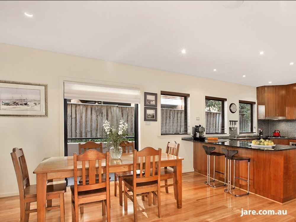The upper floor holds three bedrooms, main with en-suite and walk-in robe opening to a calming aromatic lavender potted balcony with a leafy and private outlook. The main living floor with a large open entertainers style kitchen with stainless steel appliances opens onto a generous combined dining and living area, spilling out on to an oversized sun-soaked courtyard peppered with pavers, lawn, surrounded by a canopy of mixed native trees, resulting in uninterrupted privacy.