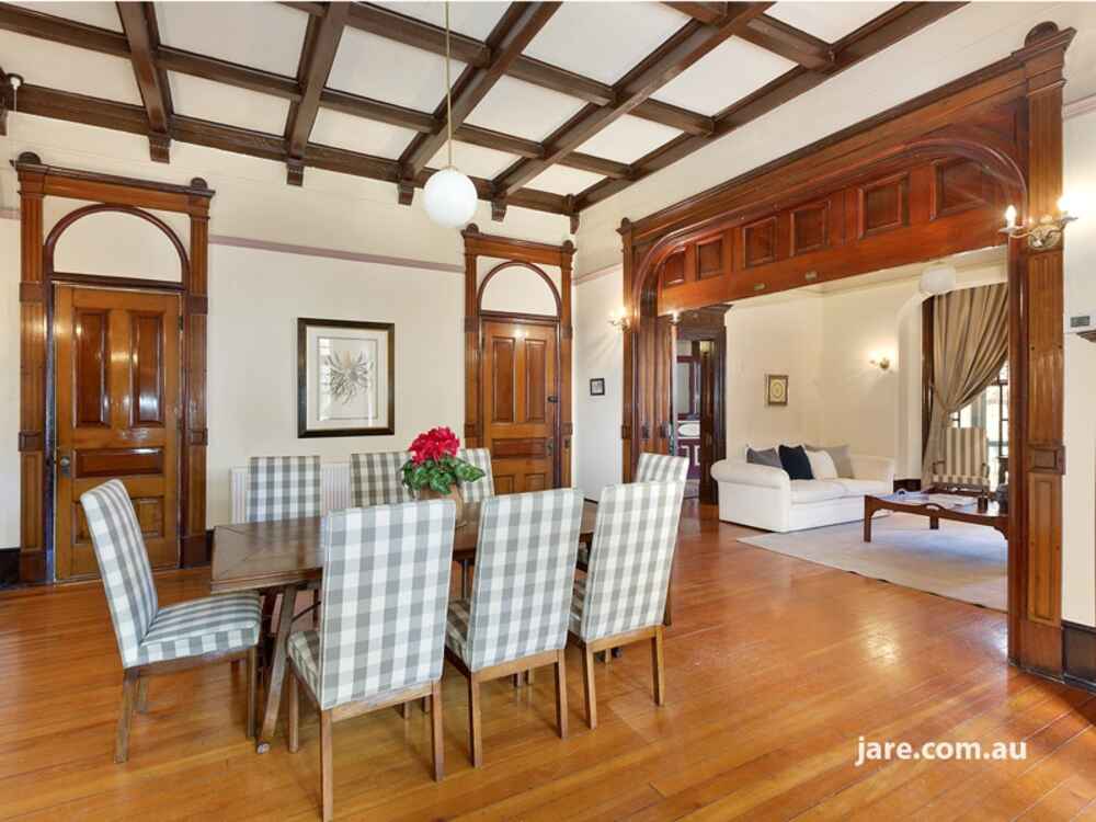 Dividing the living and dining rooms is an extraordinary three-metre wide vertically sliding door panelled in New Guinea cedar and blackwood. Also in excellent condition in these rooms are oversized panel doors and wide architraves of oak and rosewood.