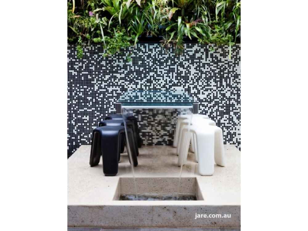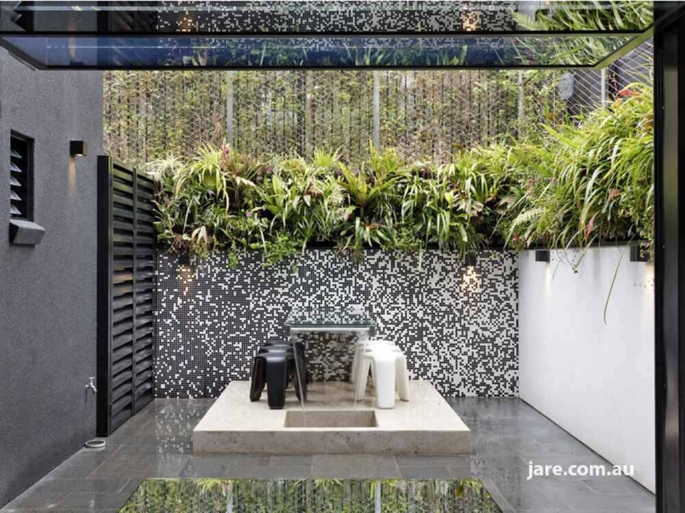 Rear courtyard with vertical gardens, suspended glass table waterfall and gas BBQ bayonet