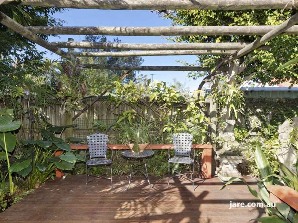 Magical north-facing tropical garden oasis with a pergola-shaded deck