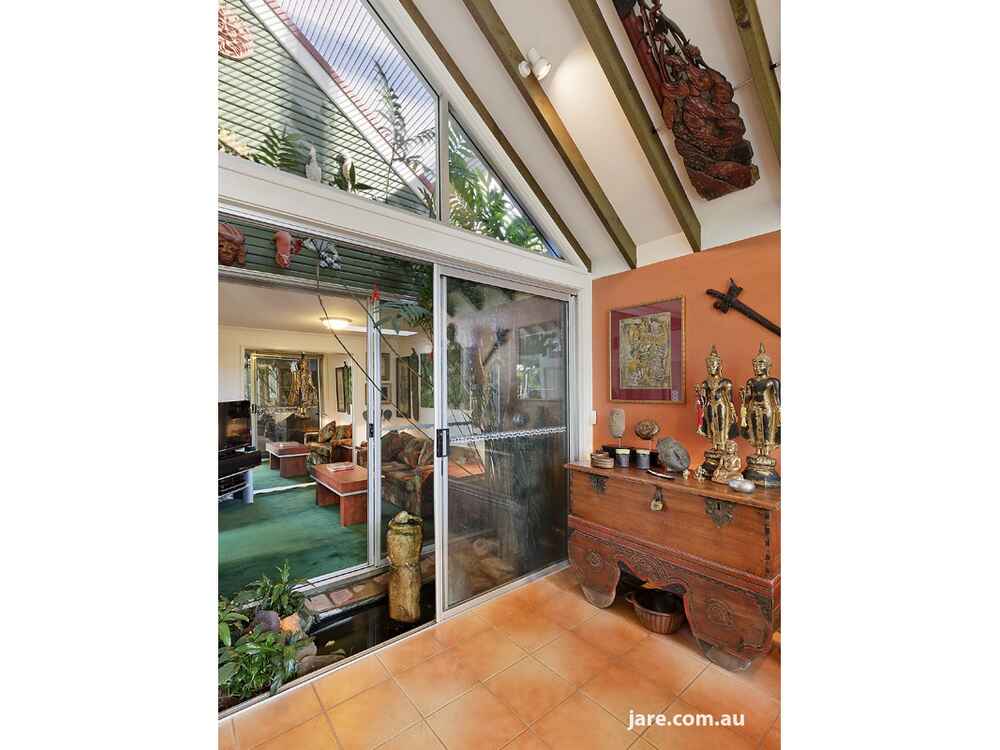 Unique interior atrium with water feature, fish and large palms