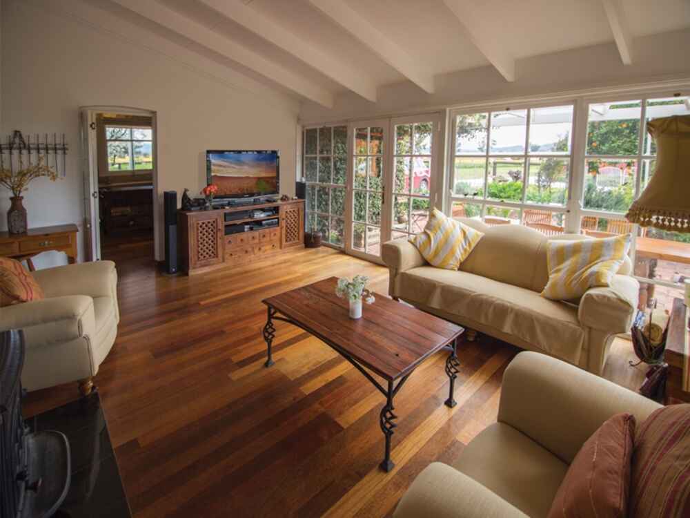 A sunlit north facing family room with a slow combustion stove