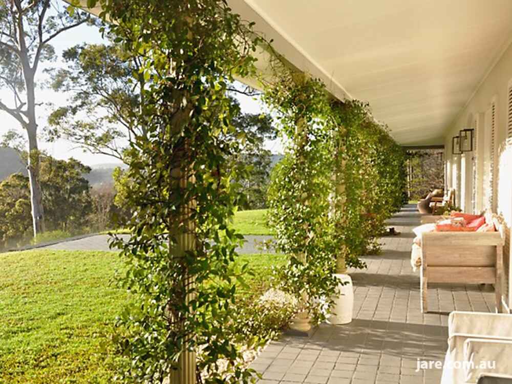 Shady vine-covered verandah and sprawling manicured lawns with glorious rural outlook