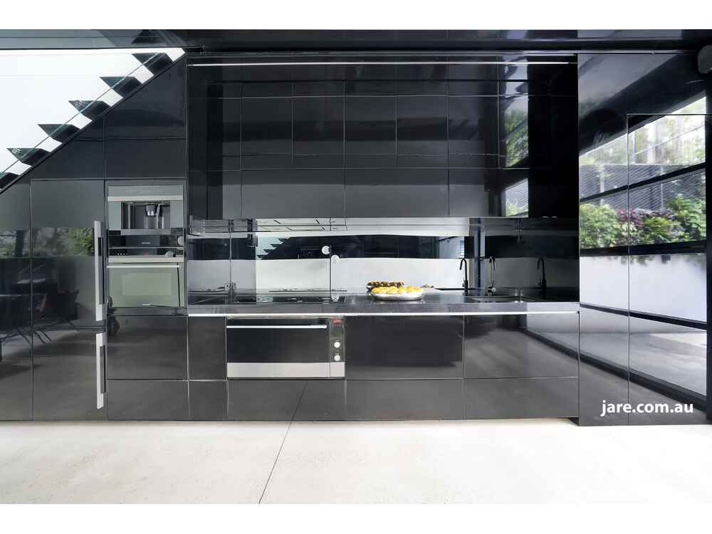 Sleek gas kitchen, custom cabinetry, glass splashbacks